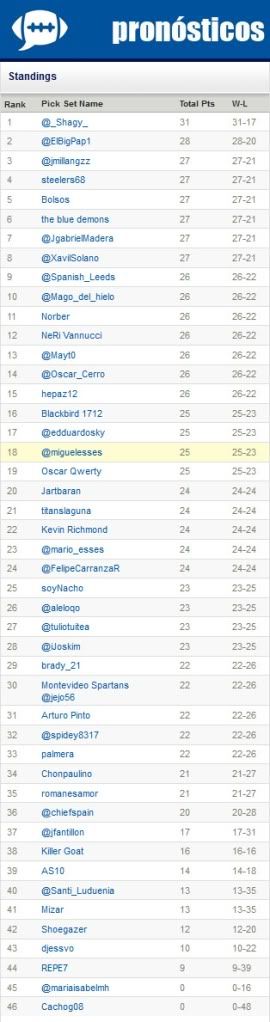 Vaya semana la que tuvimos en la NFL. Estuvo llena de resultados sorpresivos, al menos para la mayoría de nosotros. Porque no todos tuvieron muchos conflictos eligiendo ganadores: esta semana @Spanish_Leeds logró llevarse los pronósticos de la jornada con 11 aciertos, una excelente cifra. Y la tabla global marcha así:
