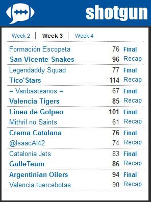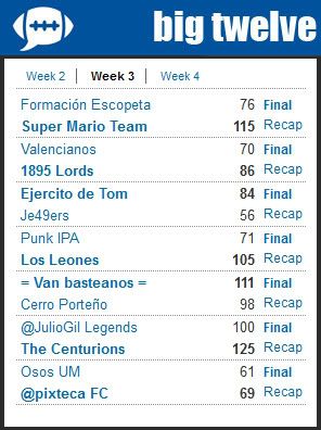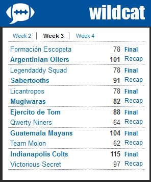 Esta semana fue verdaderamente lamentable para los equipos "representativos" de este blog, ya que nos fuimos 0-3. Deseariamos culpar a los árbitros, pero nos acordamos que en el fantasy football no hay. De cualquier forma felicidades a todos y mucha suerte a todos los equipos en la semana 4.