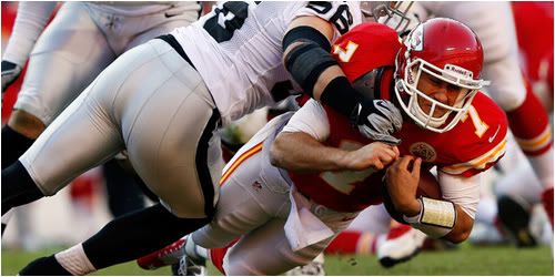 Brady Quinn, que tomó los controles del equipo después de que Matt Cassel saliera con una conmoción cerebral, tuvo que dejar el partido contra los Raiders por lo que los Chiefs llaman "una lesión en la cabeza". Fue llevado al locker y no regresó al encuentro.
