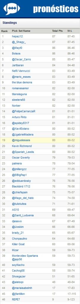 Esta semana fue bastante interesante en los pronósticos, en esencia porque muchos resultados se fueron dando conforme a lo esperado. De hecho en esta jornada tuvimos 8 líderes, con Cachog08, Chonpaulino, romanesamor, @chiefspain, @Mago_del_hielo, @Mayt0, NeRi Vannucci y hepaz12 acertando a 12 de los 14 partidos.Muchas felicidades a todos ellos.