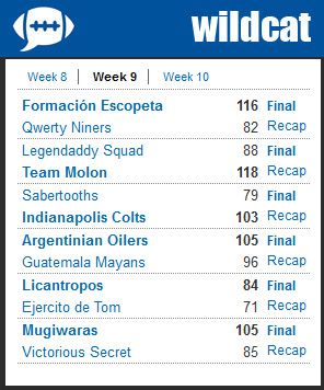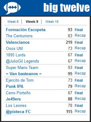 Big Twelve: 1895 Lords no ganó esta semana, pero empató para ponerse con marca de 8-0-1, mientras que el segundo puesto es un empate entre The Centurions y Formación Escopeta con 6-3.
