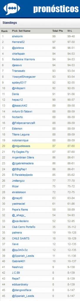 La semana 9 de la NFL estuvo llena de sorpresas, tantas que hubo un empate quíntuple en el primer lugar de los pronósticos semanales. Los 5 que ganaron esta jornada fueron Denis, Arturo El-Tatawi, chiefspain, Trianasato y Herrera52. Muchas felicidades a ellos, en especial a los 3 que pusieron en sus pronósticos que Tampa Bay ganaba esta semana.
